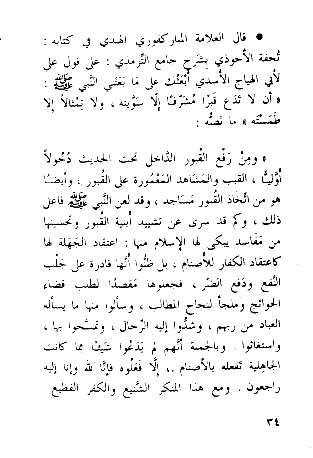 * قال العلامة المباركفوري الهندي في كتابه: تُحفة الأحوذي بشِرَح جامع التِّرمذي: على قول علي لأبي الهياج الأسدي: «أبعثك على ما بعثني النبي صلى الله عليه وسلم: "أن لا تدع قبرًا مشرفًا إلا سويته، ولا تمثالًا إلا طمسته"» ما نصه: