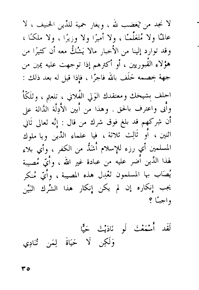 لا نجد من يَغضب لله، ويغار حميه للدين الحنيف، لا عالمًا ولا متعلمًا، ولا أميرًا ولا وزيرًا، ولا ملكًا، وقد توارد إلينا من الأخبار ما لا يشك معه أن كثيرًا من هؤلاء القبوريين، أو أكثرهم إذا توجهت عليه يمين من خصمه حلف بالله فاجرًا، فإذا قيل له بعد ذلك: احلف بشيخك ومعتقدك الولي الفلاني، تلعثم، وتلكأ، وأبى، واعترف بالحق، وهذا من أبين الأدلة الدالة على أن شركهم قد بلغ فوق شرك من قال: إنه تعالى ثاني اثنين، أو ثالث ثلاثة.