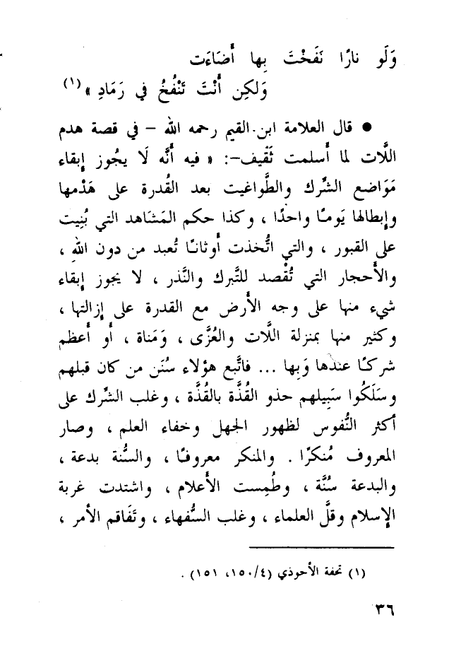* قال العلامة ابن القيم رحمه الله - في قصة هدم الَّلات لما أسلمت ثَقيف-: "فيه أنَّه لا يجُوز إبقاء مَوَاضع الشِّرك والطَّواغيت بعد القُدرة على هَدْمها، وإبطالها يَومًا واحدًا، وكذا حكم المَشَاهد التي بُنِيت على القبور، والتي اتُّخذت أوثانًا تعبد من دون الله، والأحجار التي تقصد للتبرك والنذر، لا يجوز إبقاء شيء منها على وجه الأرض مع القدرة على إزالتها، وكثير منها بمنزلة اللات والعزى، ومناة، أو أعظم شركًا عندها وبها ...
