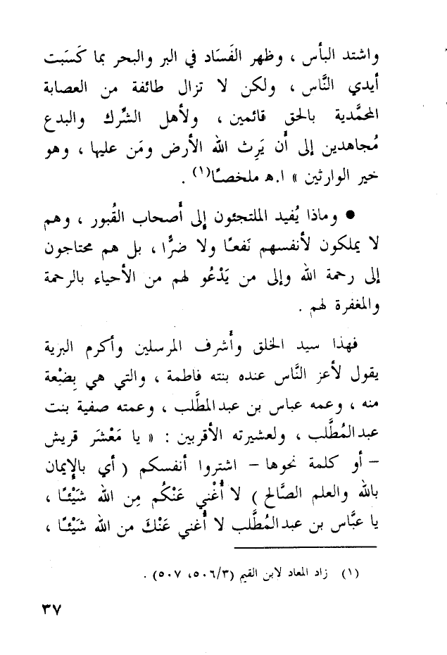 واشتد البأس، وظهر الفساد في البر والبحر بما كسبت أيدي الناس، ولكن لا تزال طائفة من العصابة المحمدية بالحق قائمين، ولأهل الشرك والبدع مجاهدين، إلى أن يرث الله الأرض ومن عليها، وهو خير الوارثين" ا. هـ. ملخصًا.