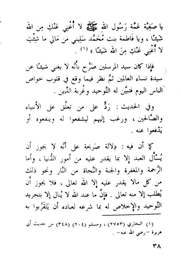 «يا صَفِيَّة عَمَّة رَسُول الله صلى الله عليه وسلم لا أُغْنِي عَنْكِ مِن الله شَيئًا، ويا فَاطمة بنت مُحَمَّد، سَلِيني من مَالي ما شِئْتِ لا أُغْنِي عَنْكِ مِنَ الله شيئًا» ".