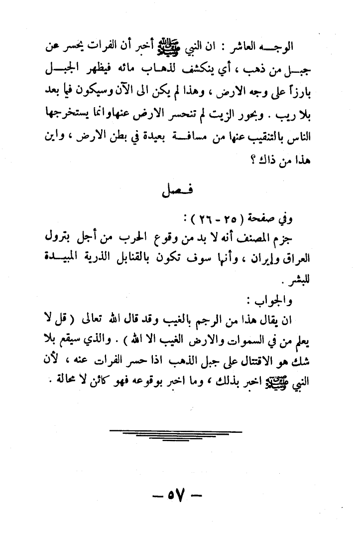 الوجه العاشر: أن النبي - صلى الله عليه وسلم - أخبر أن الفرات يحسر عن جبل من ذهب, أي ينكشف لذهاب مائه فيظهر الجبل بارزاً على وجه الأرض, وهذا لم يكن إلى الآن وسيكون فيما بعد بلا ريب. وبحور الزيت لم تنحسر الأرض عنها وإنما يستخرجها الناس بالتنقيب عنها من مسافة بعيدة في بطن الأرض, وأين هذا من ذاك؟