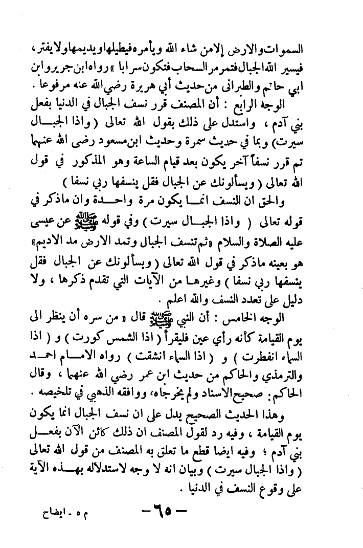 وهذا الحديث الصحيح يدل على أن نسف الجبال إنما يكون يوم القيامة, وفيه رد لقول المصنف إن ذلك كائن الآن بفعل بني آدم؛ وفيه أيضا قطع ما تعلق به المصنف من قول الله تعالى (وإذا الجبال سيرت) وبيان أنه لا وجه لاستدلاله بهذه الآية على وقوع النسف في الدنيا.