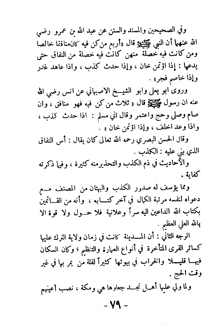 وفي الصحيحين والمسند والسنن عن عبد الله بن عمرو رضي الله عنهما أن النبي - صلى الله عليه وسلم - قال «أربع من كن فيه كان منافقا خالصا ومن كانت فيه خصلة منهن كانت فيه خصلة من النفاق حتى يدعها: إذا اؤتمن خان, وإذا حدث كذب, وإذا عاهد غدر وإذا خاصم فجر».