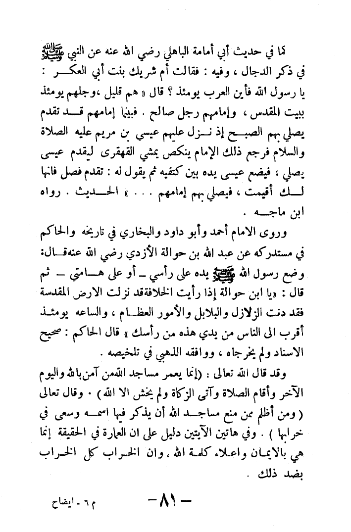كما في حديث أبي أمامة الباهلي رضي الله عنه عن النبي - صلى الله عليه وسلم - في ذكر الدجال, وفيه: فقالت أم شريك بنت أبي العكر: يا رسول الله فأين العرب يومئذ؟ قال «هم قليل, وجلهم يومئذ ببيت المقدس, وإمامهم رجل صالح. فبينما إمامهم قد تقدم يصلي بهم الصبح إذ نزل عليهم عيسى بن مريم عليه الصلاة والسلام فرجع ذلك الإمام ينكص يمشي القهقرى ليقدم عيسى يصلي, فيضع عيسى يده بين كتفيه ثم يقول له: تقدم فصل فإنها لك أقيمت, فيصلي بهم إمامهم ...» الحديث. رواه ابن ماجه.