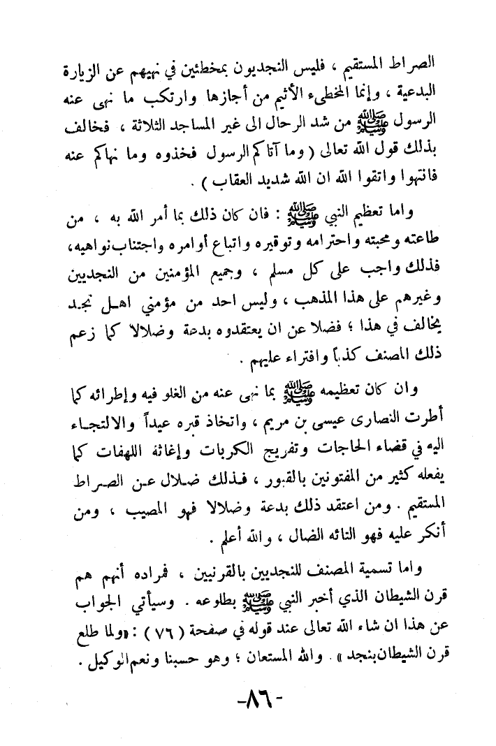 الصراط المستقيم, فليس النجديون بمخطئين في نهيهم عن الزيارة البدعية, وإنما المخطئ الأثيم من أجازها وارتكب ما نهى عنه الرسول - صلى الله عليه وسلم - من شد الرحال إلى غير المساجد الثلاثة, فخالف بذلك قول الله تعالى (وما آتاكم الرسول فخذوه وما نهاكم عنه فانتهوا واتقوا الله إن الله شديد العقاب).
