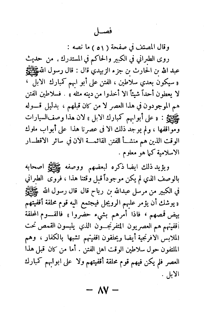 روى الطبراني في الكبير والحاكم في المستدرك, من حديث عبد الله بن الحارث بن جزء الزبيدي قال: قال رسول الله - صلى الله عليه وسلم - «سيكون بعدي سلاطين, الفتن على أبوابهم كمبارك الإبل, لا يعطون أحداً شيئاً إلا أخذوا من دينه مثله». فسلاطين الفتن هم الموجودون في هذا العصر لا من كان قبلهم, بدليل قوله - صلى الله عليه وسلم -: «على أبوابهم كمبارك الإبل» لأن هذا وصف السيارات ومواقفها, ولم يوجد ذلك إلا في عصرنا هذا على أبواب ملوك الوقت الذين هم منشأ الفتن القائمة الآن في سائر الأقطار الإسلامية كما هو معلوم.