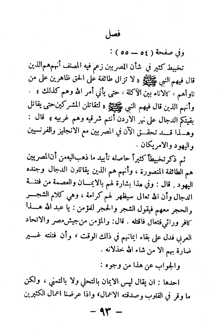 تخبيط كثير في شأن المصريين زعم فيه المصنف أنهم هم الذين قال فيهم النبي - صلى الله عليه وسلم - «لا تزال طائفة على الحق ظاهرين على من ناوأهم, كالإناء بين الأكلة, حتى يأتي أمر الله وهم كذلك». وأنهم الذين قال فيهم النبي - صلى الله عليه وسلم - «لتقاتلن المشركين حتى يقاتل بقيتكم الدجال على نهر الأردن أنتم شرقيه وهم غربيه» قال: وهذا قد تحقق الآن في المصريين مع الإنجليز والفرنسيين واليهود والأمريكان.
