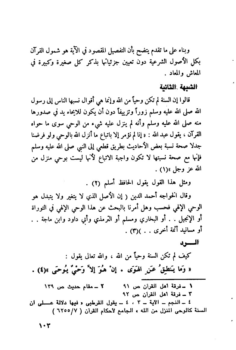 (¬4) [النجم: 3، 4]، يقول القرطبي: «فيها دلالة على أنَّ السُنَّة َ كالوحي المُنَزَّلِ من الله» " الجامع لأحكام القرآن ": 7/ 6255.