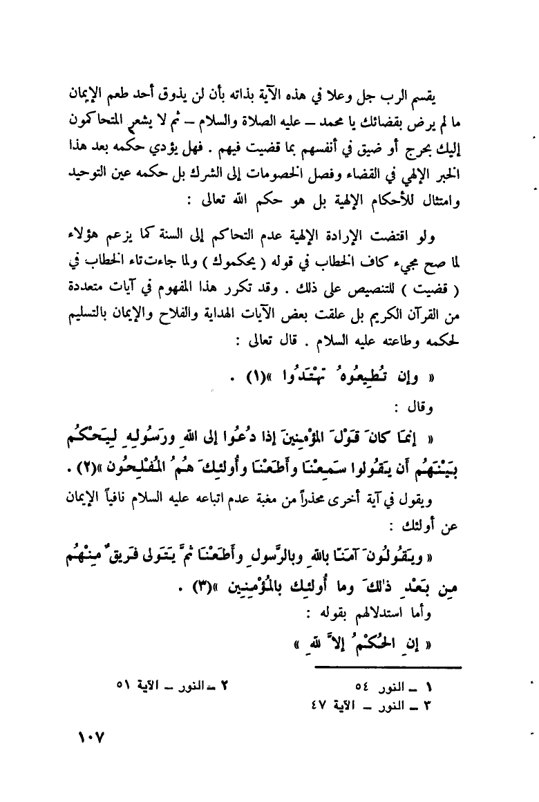 فهل يُؤَدِّي حكمه بعد هذا الخبر الإلهي في القضاء وفصل الخصومات إلى الشرك بل حكمه عين التوحيد وامتثال للأحكام الإلهية بل هو حكم الله تعالى: ولو اقتضت الإرادة الإلهية عدم التحاكم إلى السُنَّةِ كما يزعم هؤلاء لما صح مجيء كاف الخطاب في قوله: {يُحَكِّمُوكَ} ولما جاءت تاء الخطاب في {قَضَيْتَ} للتنصيص على ذك. وقد تكرر هذا المفهوم في آيات متعددة من القرآن الكريم بل علقت بعض الآيات الهداية والفلاح والإيمان بالتسليم لحكمه وطاعته - عَلَيْهِ السَّلاَمُ -. قال تعالى: {وَإِنْ تُطِيعُوهُ تَهْتَدُوا} (¬1).