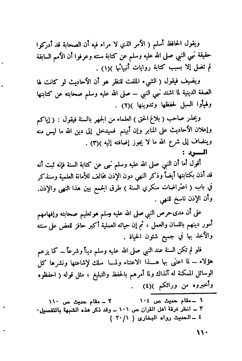 أقول أما النبي - صَلََّى اللهُ عَلَيْهِ وَسَلَّمَ - نهى عن كتابة السنة فإنه ثبت أنه قد أذن بكتابتها أيضًا وذكر النهي دون الإذن مخالف للأمانة العلمية وسنذكر في باب (اعتراضات منكري السُنَّة) طرق الجمع بين هذا النهي والإذن. وأنَّ الإذن ناسخ للنهي.