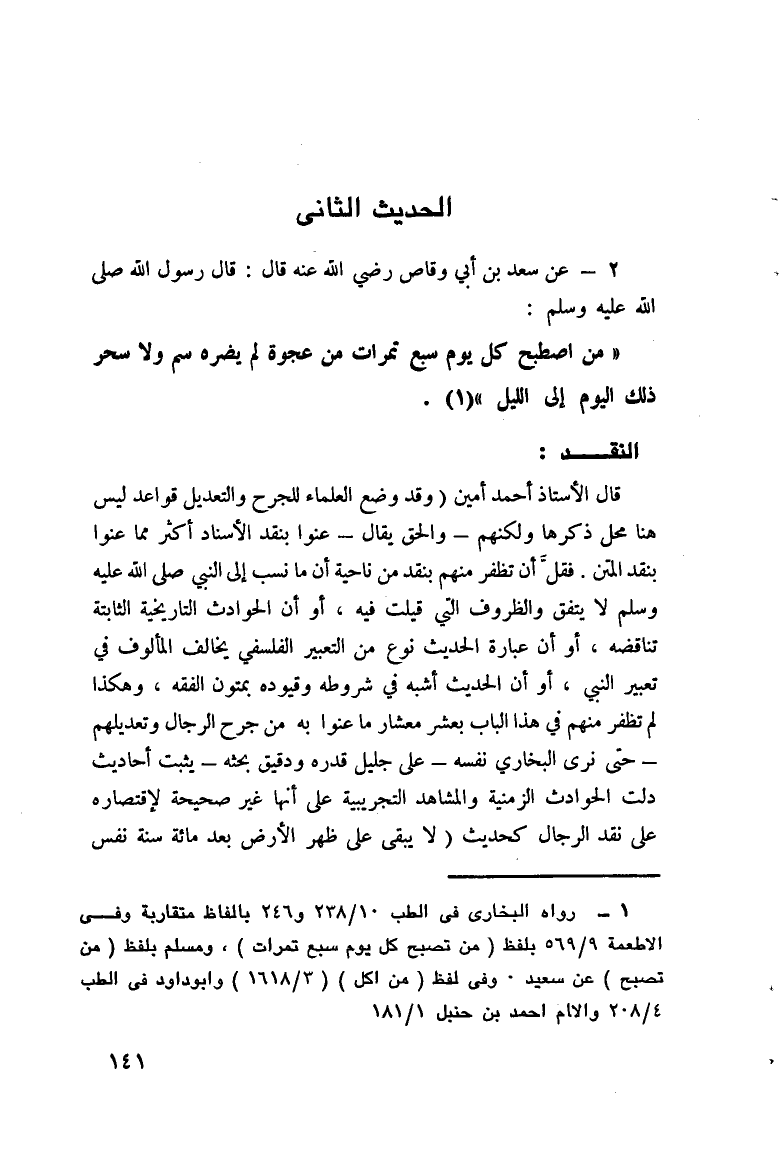 (¬1) رواه البخاري في الطب: 10/ 238 و 246 بألفاظ متقاربة، وفي الأطعمة: 9/ 569 بلفظ: «مَنْ تَصَبَّحَ كُلَّ يَوْمٍ سَبْعَ تَمَرَاتٍ»، ومسلم بلفظ: «مَنْ تَصَبَّحَ» عن سعيد. وفي لفظ: «مَنْ أَكَلَ» 3/ 1618، وأبو داود في الطب: 4/ 208، والإمام أحمد بن حنبل: 1/ 181.