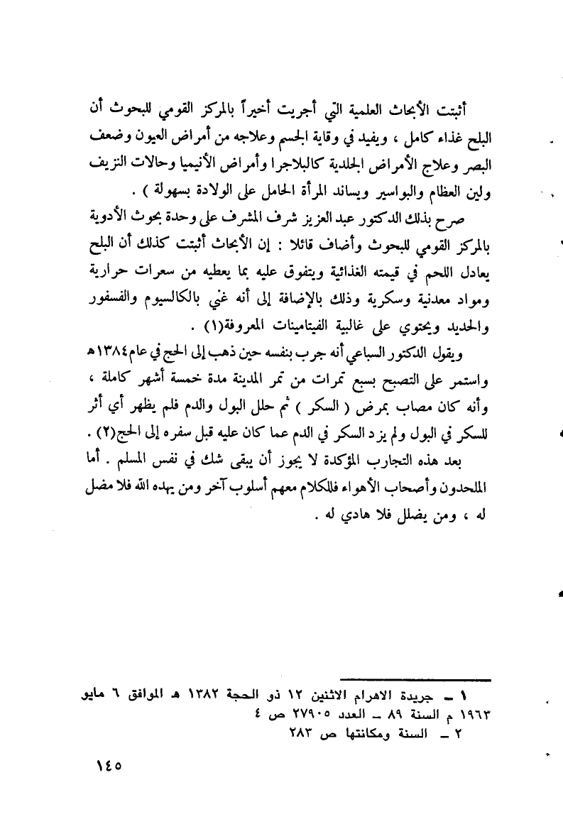 صَرَّحَ بذلك الدكتور عبد العزيز شرف المشرف على وحدة بحوث الأدوية بالمركز القومي للبحوث وأضاف: «إِنَّ الأبحاث أثبتت كذلك أَنَّ البلح يعادل اللحم في قيمته الغذائية ويتفوق عليه بما يعطيه من سعرات حرارية ومواد معدنية وسكرية وذلك بالإضافة إلى أنه غني بالكالسيوم والفُسْفُورِ والحديد ويحتوي على غالبية الفيتامينات المعروفة» (1).