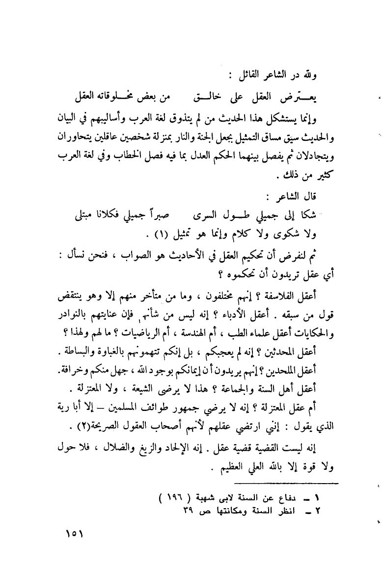 يَعْتَرِضُ العَقْلُ عَلَى خَاِلٍق * ... * ... * مِنْ بَعْضِ مَخْلُوقَاتِهِ العَقْلُ (*).