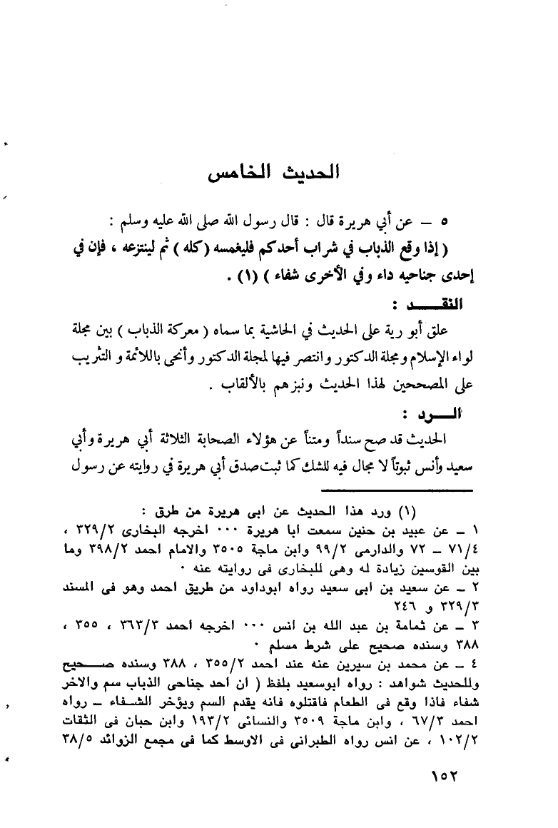 4 - عن محمد بن سيرين عنه عند أحمد: 2/ 355، 388 وسنده صحيح وللحديث شواهد: رواه أبو سعيد بلفظ ««إِنَّ أَحَدَ جَنَاحَيِ الذُّبَابِ سُمٌّ، وَالآخَرَ شِفَاءٌ، فَإِذَا وَقَعَ فِي الطَّعَامِ [فَامْقُلُوهُ]، فَإِنَّهُ يُقَدِّمُ السُّمَّ وَيُؤَخِّرُ الشِّفَاءَ» رواه أحمد: 3/ 67، وابن ماجه: 3509 والنسائي: 2/ 193 وابن حبان في " الثقات ": 2/ 102، عن أنس رواه الطبراني في " الأوسط " كما في " مجمع الزوائد ": 5/ 38.
