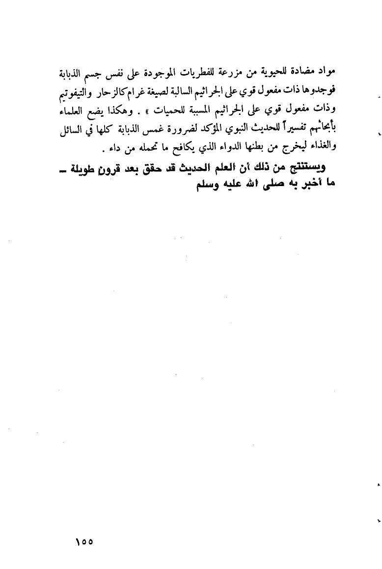 مواد مضادة للحيوية من مزرعة للفطريات الموجودة على نفس جسم الذبابة فوجدوها ذات مفعول قوي على الجراثيم السالبة لصيغة غرام كالزحار والتيفونيم وذات مفعول قوي على الجارثيم المسببة للحميات». وهكذا يضع العلماء بأبحاثهم تفسيرًا للحديث النبوي المؤكد لضرورة غمس الذبابة كلها في السائل والغذاء ليخرج من بطنها الدواء الذي يكافح ما تحمله من داء.