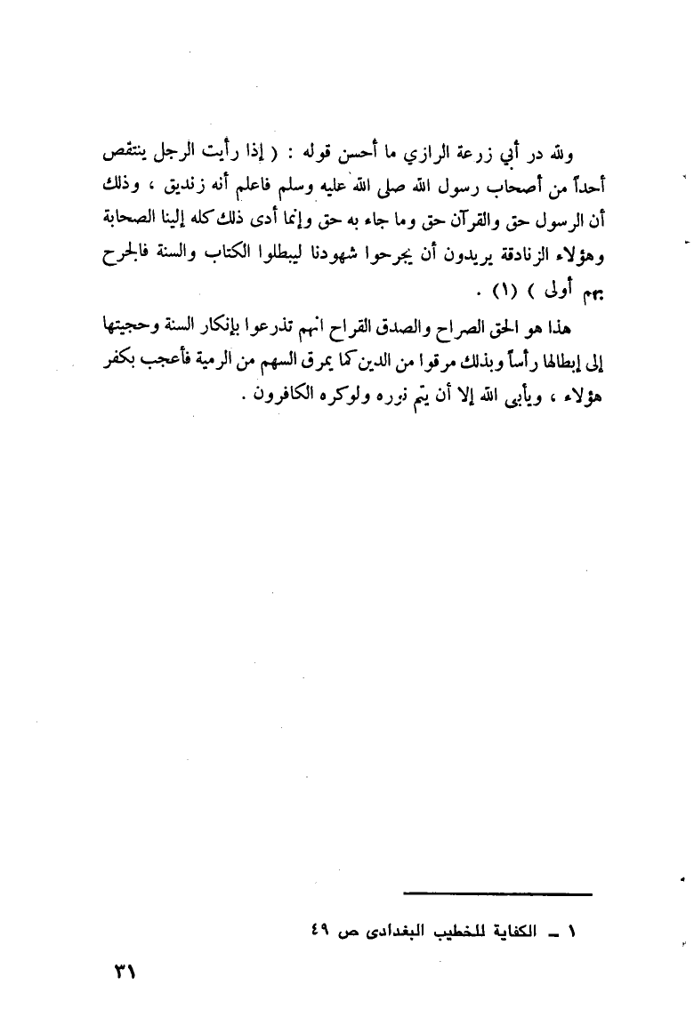 ولله درُّ أبي زُرعة الرازي ما أحسن قوله: «إِذَا رَأَيْتَ الرَّجُلَ يَنْتَقِصُ أَحَدًا مِنْ أَصْحَابِ رَسُولِ اللَّهِ صَلَّى اللَّهُ عَلَيْهِ وَسَلَّمَّ فَاعْلَمْ أَنَّهُ زِنْدِيقٌ , وَذَلِكَ أَنَّ الرَّسُولَ صَلَّى اللَّهُ عَلَيْهِ وَسَلَّمَّ حَقٌّ , وَالْقُرْآنَ حَقٌّ , وَمَا جَاءَ بِهِ حَقٌّ، وَإِنَّمَا أَدَّى ذَلِكَ كُلَّهُ إِلَيْنَا الصَحَابَةُ، وَهَؤُلاَءِ الزَنَادِقَةُ يُرِيدُونَ أَنْ يُجَرِّحُوا شُهُودَنَا لِيُبْطِلُوا الْكِتَابَ وَالسُّنَّةَ , وَالْجَرْحُ بِهِمْ أَوْلَى» (1).
