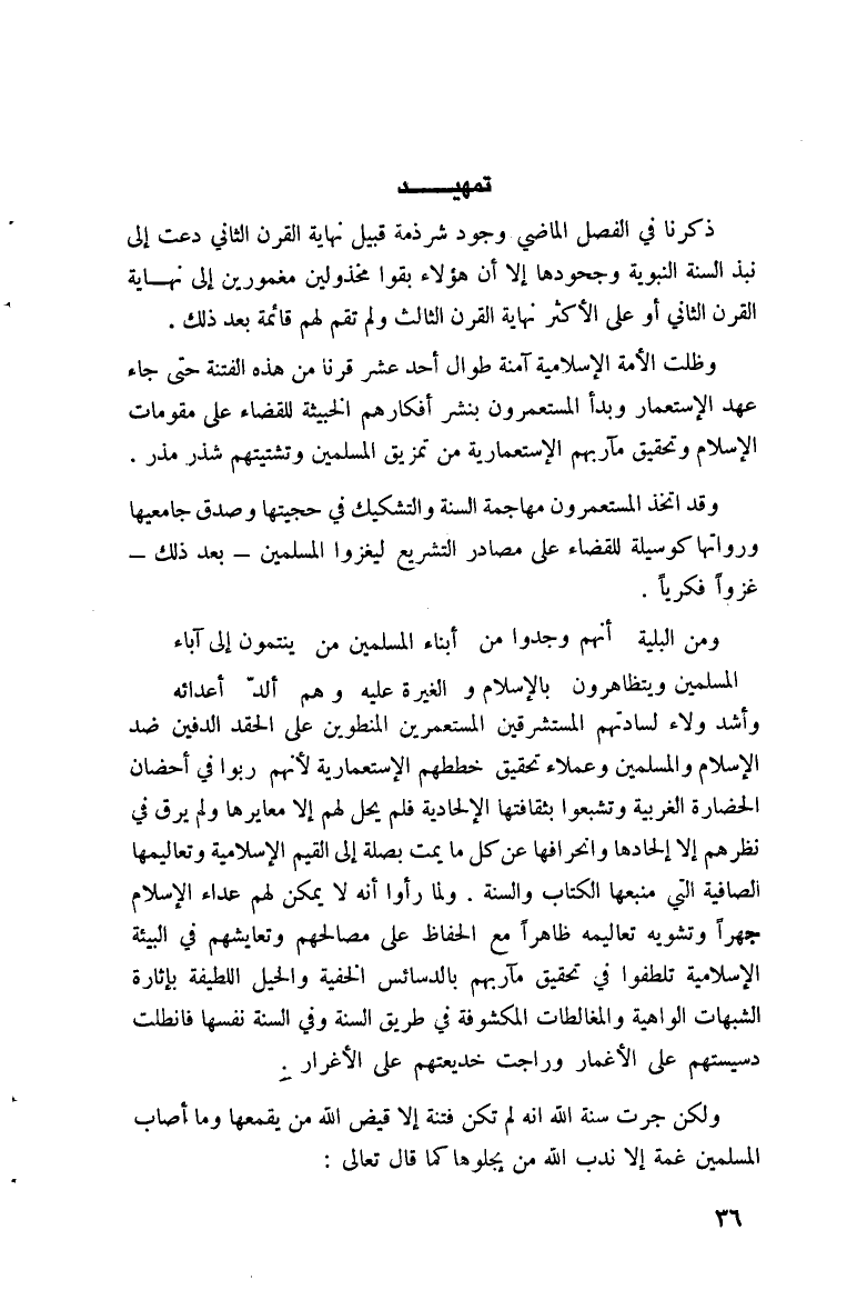 وظلت الأُمَّةُ الإسلامية آمنة طوال أحد عشر قرنًا من هذه الفتنة حتى جاء عهد الاستعمار وبدأ المستعمرون بنشر أفكارهم الخبيثة للقضاء على مقومات الإسلام وتحقيق مآربهم الاستعمارية من تمزيق المسلمين وتشتيتهم شذر مذر.