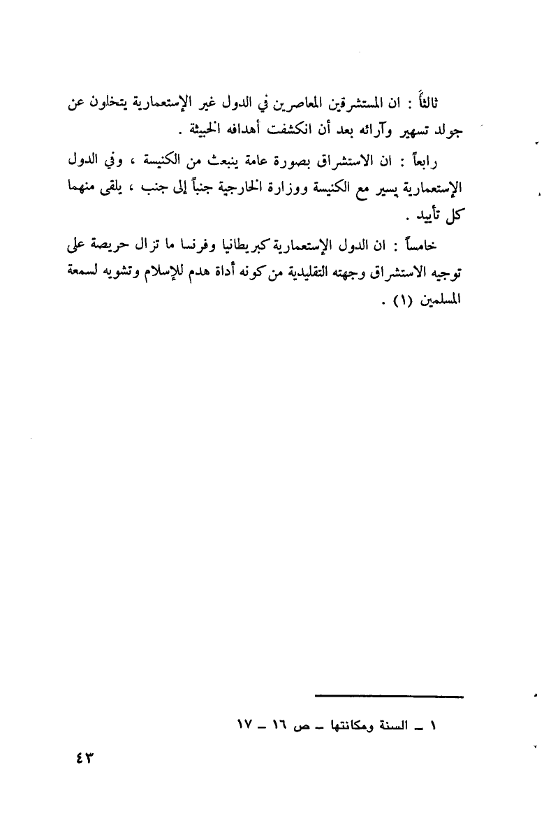 ثالثًا: إنَّّ المستشرقين المعاصرين في الدول غير الاستعمارية يخلَّون عن جولدتسيهر وآرائه بعد أنْ انكشفت أهدافه الخبيثة.