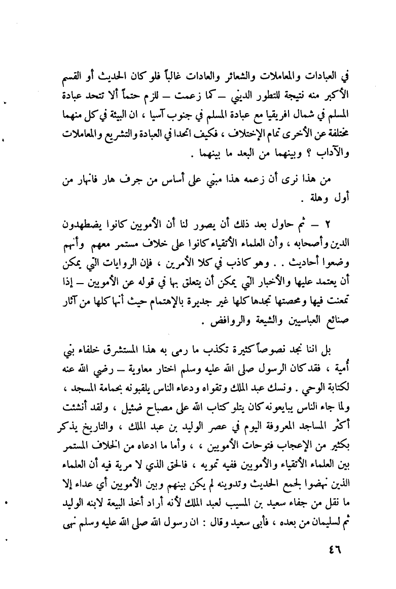 في العبادات والمعاملات والشعائر والعادات غالبًا فلو كان الحديث أو القسم الأكبر منه نتيجة للتطور الديني - كما زعمت - للزم حتمًا أَلاَّ تتحد عبادة المسلم في شمال إفريقيا مع عبادة المسلم في جنوب آسيا، إنَّ البيئة في كل منهما مختلفة عن الأخرى تمام الاختلاف، فكيف اتَّحَدَا في العبادة والتشريع والمعاملات والآداب؟ وبينهما من البُعد ما بينهما.