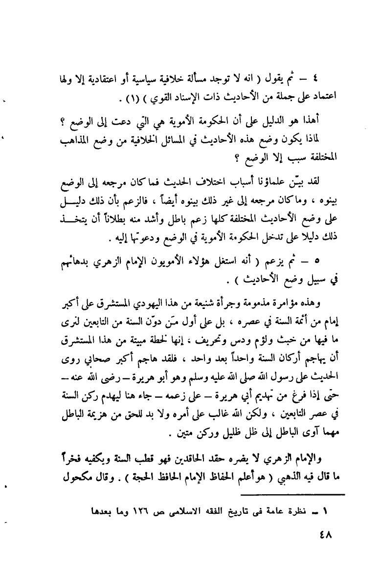 4 - ثم يقول: «إنه لا توجد مسألة خلافية سياسية أو اعتقادية إِلاَّ ولها اعتماد على جملة من الأحاديث ذات الإسناد القوي» (¬1).