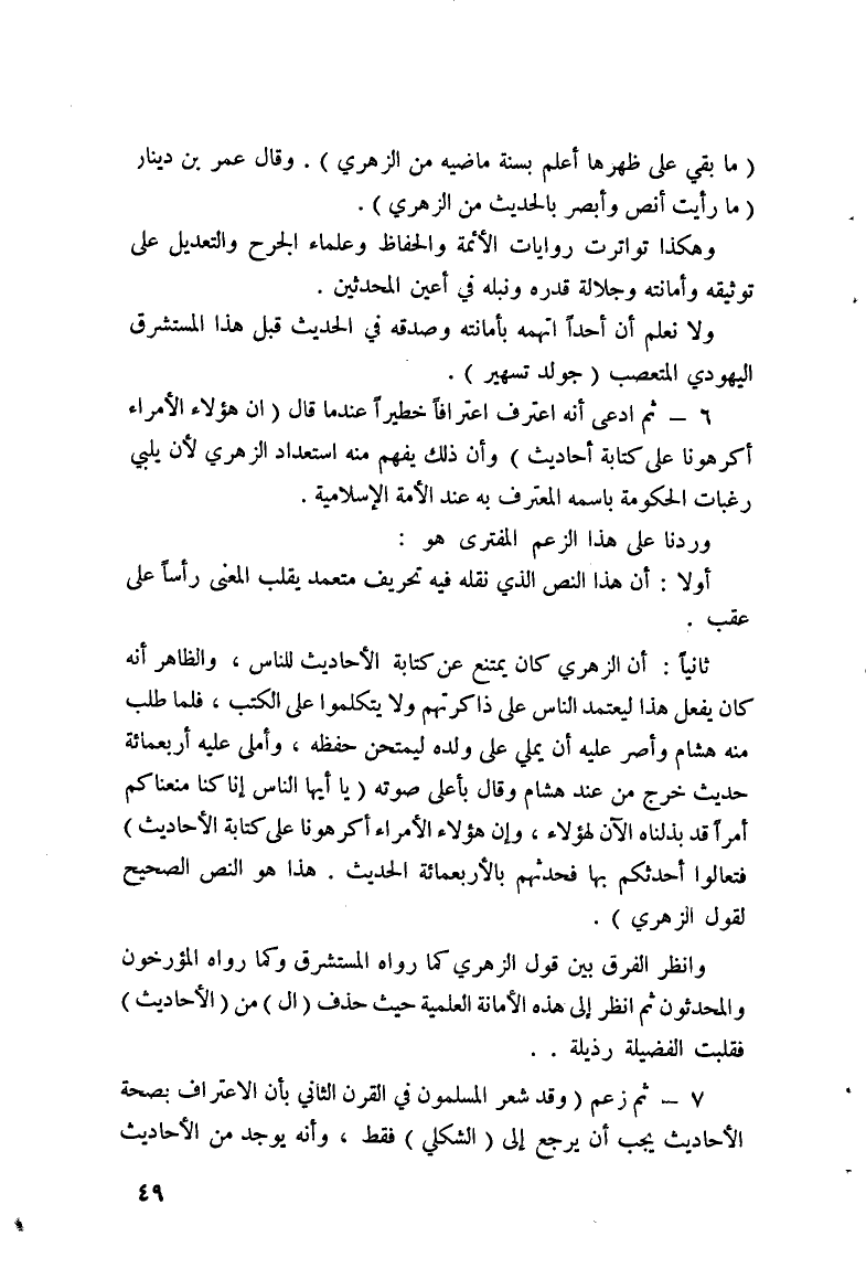 وانظر الفرق بين قول الزهري كما رواه المستشرق وكما رواه المؤرخون والمحدثون ثم انظر إلى هذه الأمانة حيث حذف «الـ» من «الأحاديث» فقلبت الفضيلة رذيلة ...