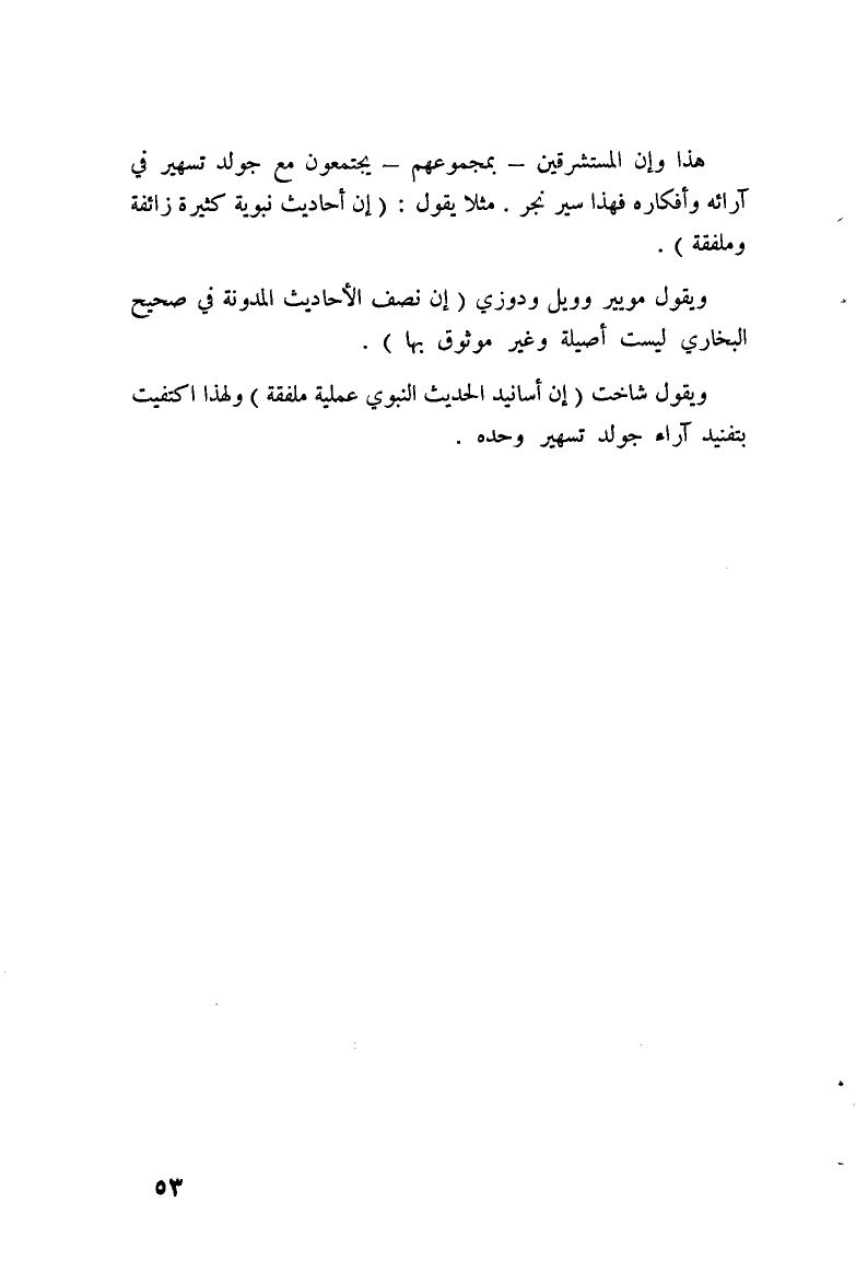 ويقول شاخت: «إنَّ أسانيد الحديث النبوي عملية مُلَفَّقَة» ولهذا اكتفيت بتفنيد آراء جولدتسيهر وحده.