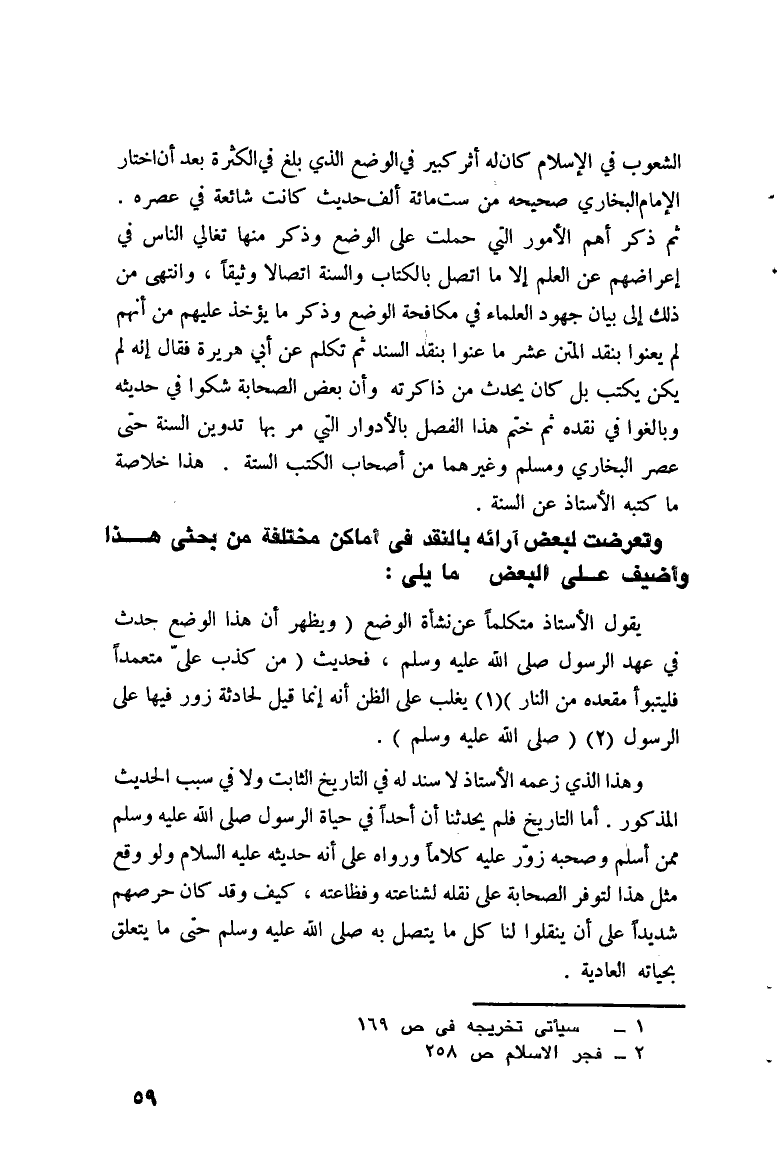 الشعوب في الإسلام كان له أثر كبير في الوضع الذي بلغ في الكثرة بعد أنْ اختار الإمام البخاري " صحيحه " من ستمائة ألف حديث كانت شائعة في عصره. ثم ذكر أهم الأمور التي حملت على الوضع وذكر منها تغالي الناس في أغراضهم عن العلم إلاَّ ما اتصل بالكتاب والسُنَّة اتصالاً وثيقًا، وانتهى من ذلك إلى بيان جهود العلماء في مكافحة الوضع وذكر ما يؤخذ عليهم من أنهم لم يعنوا بنقد المتن عُشْرَ ما عنوا بنقد السند ثم تكلموا عن أبي هريرة فقال: إنه لم يكن يكتب بل كان يُحَدِّثُ من ذاكرته وأنَّ بعض الصحابة شَكُّوا في حديثه وبالغوا في نقده ثم ختم هذا الفصل بالأدوار التي مَرَّ بها تدوين السُنَّة حتى عصر البخاري ومسلم وغيرهما من أصحاب الكتب الستة. هذا خلاصة ما كتبه الأستاذ عن السُنَّة.