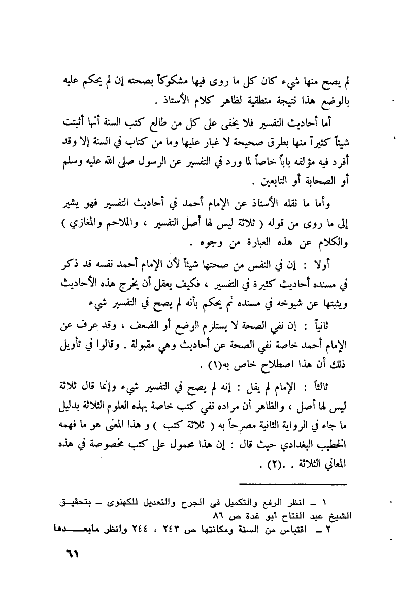 وأما ما نقله الأستاذ عن الإمام أحمد في أحاديث التفسير فهو يشير إلى ما رُوِيَ من قوله: «ثَلاَثَةُ لَيْسَ لَهَا أَصْلٌ: التَفْسِيرُ، وَالمَلاَحِمُ وَالمَغَازِي» والكلام عن هذه العبارة من وجوه.