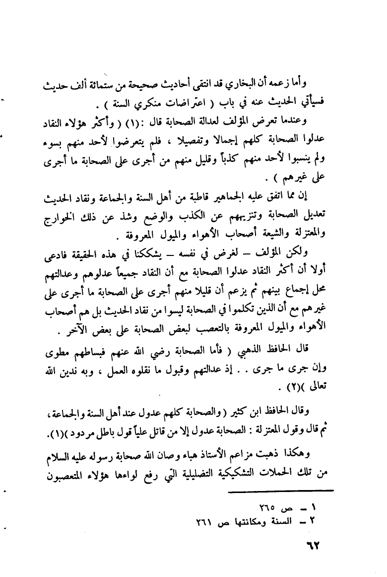 وعندما تعرض المؤلف لعدالة الصحابة قال: (¬1) «وأكثر هؤلاء النُقَّادُ عَدَّلُوا الصحابة كلهم إجمالاً وتفصيلاً، فلم يتعرَّضوا لأحد منهم بسوء ولم ينسبوا لأحد منهم كَذِبًا وقليل منهم من أجرى على الصحابة ما أجرى على غيرهم».