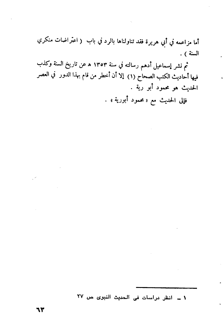 ثم نشر إسماعيل أدهم رسالته في سَنَة 1353 هـ عن تاريخ السُنَّة وَكَذَّبَ فيها أحاديث الكتب الصحاح (¬1) إلاَّ أنَّ أخطر من قام بهذا الدور في العصر الحديث هو محمود أبو رية.