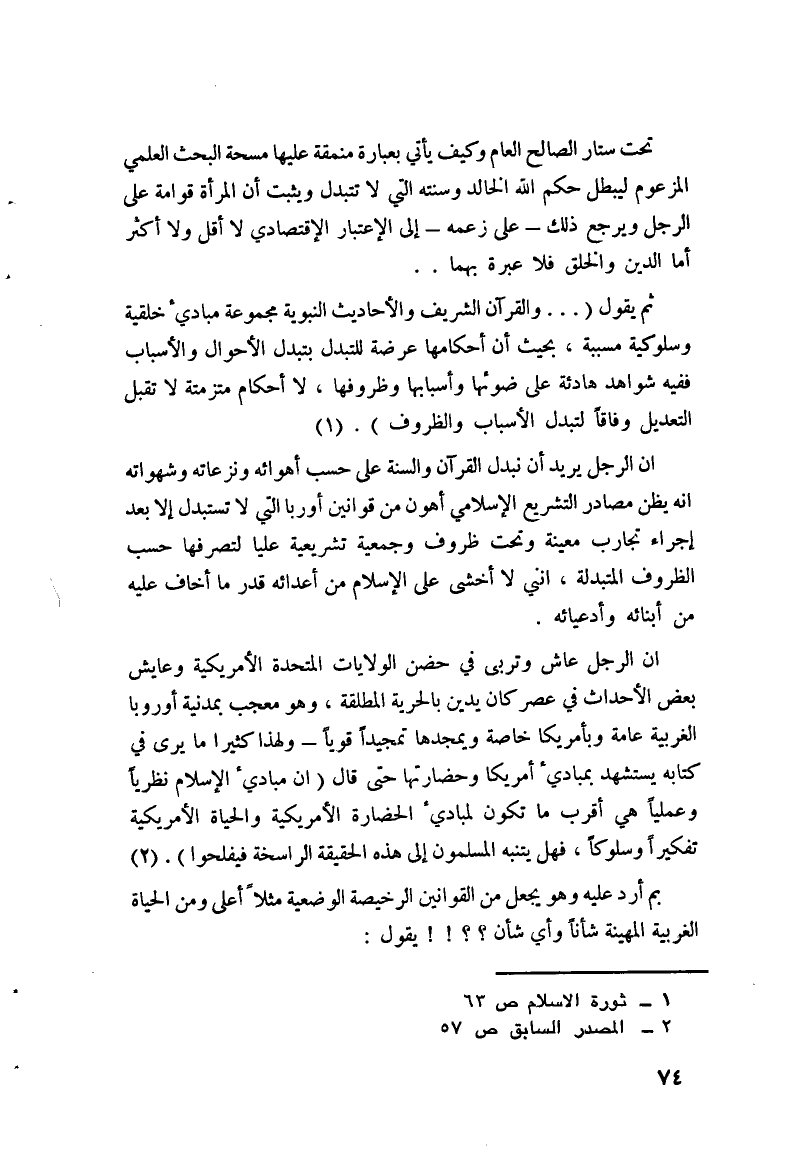 تحت ستار الصالح العام وكيف يأتي بعبارة مُنَمَّقَةٍ عليها مسحة البحث العلمي المزعوم ليبطل حكم الله الخالد وسُنَّته التي لا تتبدل ويثبت أنَّ المرأة قَوَّامَةٌ على الرجل ويرجع ذلك - على زعمه - إلى الاعتبار الاقتصادي لا أقل ولا أكثر، أما الدين والخلق فلا عبرة بهما.