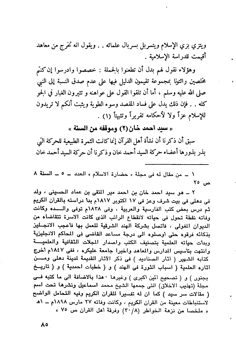 (¬2) هو سيد أحمد خان بن أحمد مير التقي بن عماد الحسيني، ولد في دهلي في بيت شرف وعِزٍّ في 17 أكتوبر 1817 م، بدأ دراسته بالقرآن الكريم ثم درس بعض كتب الفارسية والعربية، وفي 1838 م توفي والده وكانت وفاته نقطة تحول في حياته لانقطاع الراتب الذي كانت الأسرة تتقاضاه من الديوان المغولي، فاتصل بشركة الهند الشرقية للعمل بها فأعجب الإنجليز بذكائه فرقوه حتى أوصلوه إلى درجة مساعد القاضي في المحاكم الإنجليزية وبدأت حياته العملية بتصنيف الكتب وإصدار المجلات الثقافية والعلمية وانتهت بتأسيس المدارس والمعاهد وأخيرًا جامعة عليكره، ففي 1847 م أخرج كتابه الشهير " آثار الصناديد " في ذكر الآثار القديمة لمدينة دهلي، ومن آثاره العلمية " أسباب الثورة في الهند " و " خطبات أحمدية " و " تاريخ بجنور " و " تصحيح آثين أكبرى) وغيرها. هذا بالإضافة إلى ما كتبه في مجلة " تهذيب الأخلاق " التي جمعها الشيخ محمد إسماعيل ونشرها تحت اسم (مقالات سر سيد) كما أنَّ له تفسيرًا للقرآن الكريم وفيه التحامل الواضح لاستنباطات معينة من القرآن الكريم، وكانت وفاته 27 مارس 1898 م. اهـ. مُلَخَّصًا من " نزهة الخواطر ": 8/ 30 و " فرقة أهل القرآن ": ص 75.