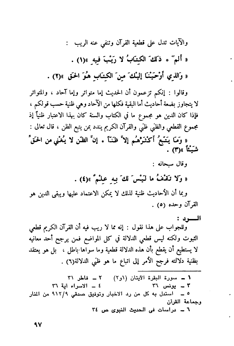 وقالوا: إنكم تزعمون أنَّ الحديث إما متواتر وإما آحاد، والمتواتر لا يتجاوز بضعة أحاديث أما البقية فكلها من الآحاد وهي ظنية حسب قولكم، فإذا كان الدين هو مجموع ما في الكتاب والسُنَّة كان بهذا الاعتبار ظنيًا إذ مجموع القطعي والظني ظني والقرآن الكريم يُنَدِّدُ بمن يتبع الظن، قال تعالى: {وَمَا يَتَّبِعُ أَكْثَرُهُمْ إِلَّا ظَنًّا إِنَّ الظَّنَّ لَا يُغْنِي مِنَ الْحَقِّ شَيْئًا} (¬3).