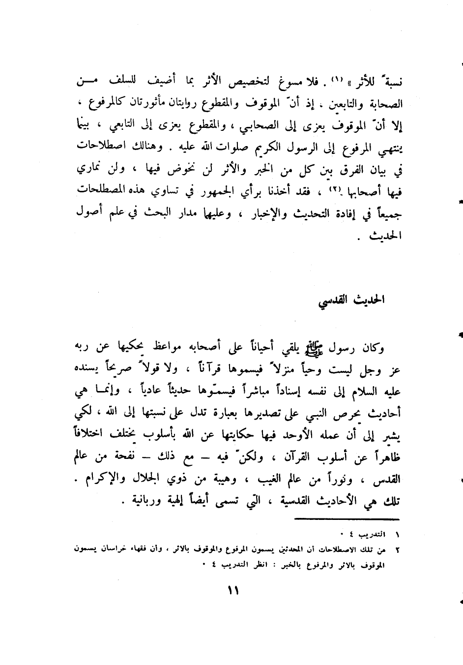 نِسْبَةً لِلأَثَرِ» (¬1). فلا مسوغ لتخصيص الأثر بما أضيف للسلف من الصحابة والتابعين، إذ أنَّ الموقوف والمقطوع روايتان مأثورتان كالمرفوع، إلاَّ أَنَّ الموقوف يُعْزَى إلى صحابي، والمقطوع يُعْزَى إلى التابعين، بينما ينتهي المرفوع إلى الرسول الكريم - صَلَوَاتُ اللهِ عَلَيْهِ -. وهنالك اصطلاحات في بيان الفرق بين كل من الخبر والأثر لن تخوض فيها، ولن نماري فيها أصحابها (¬2)، فقد أخذنا برأي الجمهور في تساوي هذه المصطلحات جَمِيعًا في إفادة التحديث والإخبار، وعليهما مدار البحث في علم أصول الحديث.
