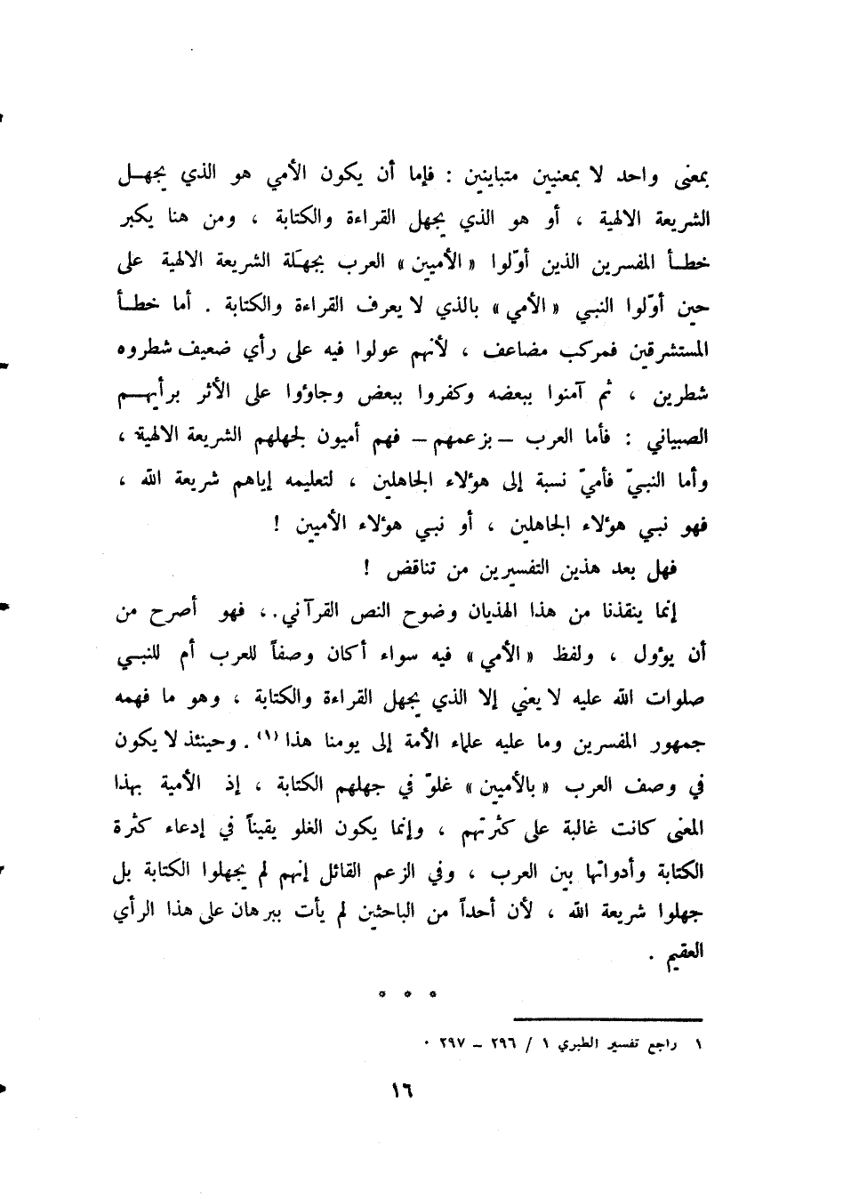 بمعنى واحد لا بمعنيين متباينين: فإما أَنْ يكون الأُمِيَّ هو الذي يجهل الشريعة الإلهية، أو هو الذي يجهل القراءة والكتابة، ومن هنا يكبر خطأ المُفَسِّرِينَ الذِينَ أَوَّلُوا «الأُمِيِّينَ» العرب بِجَهَلَةِ الشريعة الإلهية على حين أوَّلُوا النَّبِيَّ «الأُمِيَّ» بالذي لا يعرف القراءة والكتابة. أما خطأ المستشرقين فَمُرَكَّبٌ مُضَاعَفٌ، لأنهم عَوَّلُوا فيه على رأي ضعيف شطروه شطرين، ثم آمنوا ببعضه وكفروا ببعض وجاؤوا على الأثر برأيهم الصبياني: فأما العرب - بزعمهم - فهم أميُّون لجهلهم للشريعة الإلهية، وأما النَّبِيُّ فَأُمِيٌّ نسبة إلى هؤلاء الجاهلين، لتعليمه إياهم شريعة الله، فهو نبي هؤلاء الجاهلين، أو نَبِيُّ هؤلاء الأُمِيِّينَ!