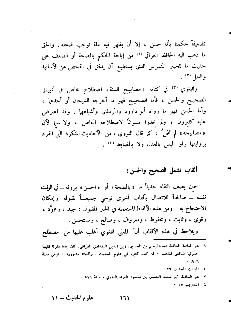 وللبغوي (¬3) في كتابه " مصابيح السنة " اصطلاح خاص في تمييز الصحيح والحسن، فأما الصحيح فهو ما أخرجه الشيخان أو أحدهما، وأما الحسن فهو ما رواه أبو داود والترمذي وأشباههما. وقد اعترض عليه كثيرون، ولم يجدوا مسوغًا لاصطلاحه الخاص، ولا سيما لأن " مصابيحه " لَمْ تَخْلُ، كما قال النووي، من الأحاديث المنكرة التي انفرد بروايتها رَاوٍ ليس بالعدل ولا بالضابط (¬4).