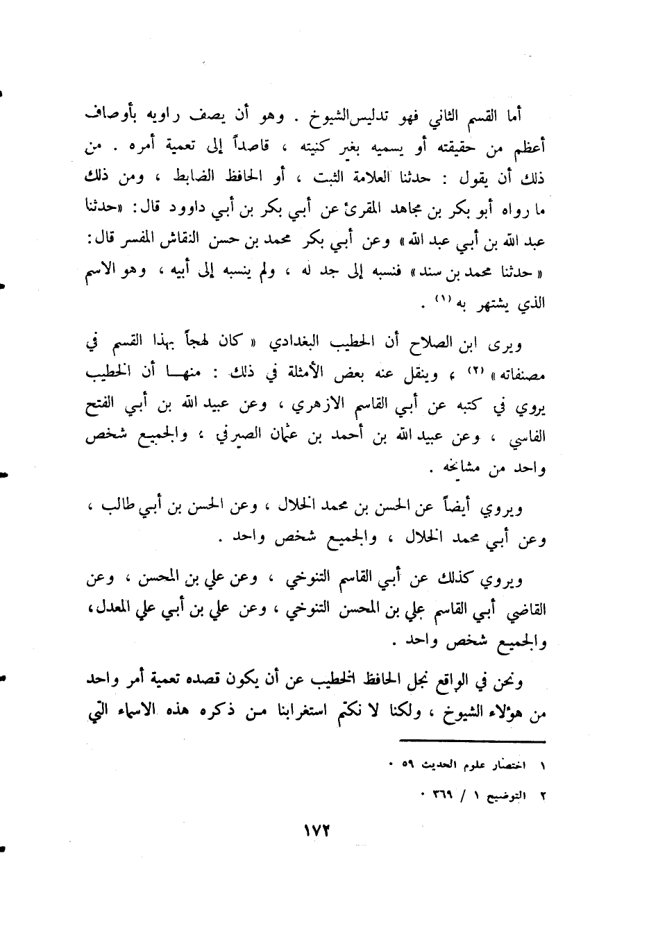 أما القسم الثاني فهو تدليس الشيوخ. وهو أن يصف راويه بأوصاف أعظم من حقيقته أو يسميه بغير كنيته، قاصدًا إلى تعمية أمره. من ذلك أن يقول: حدثنا العلامة الثبت، أو الحافظ الضابط. ومن ذلك ما رواه أبو بكر بن مجاهد المقرئ عن أبي بكر بن أبي داوود قال: «حدثنا عبد الله بن أبي عبد الله»، وعن أبي بكر محمد بن حسن النقاش المفسر قال: «حدثنا محمد بن سند» فنسبه إلى جد له، ولم ينسبه إلى أبيه، وهو الاسم الذي يشتهر به (¬1).