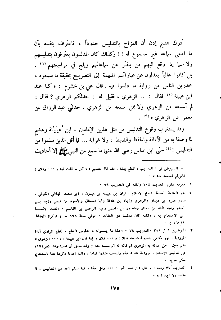 (¬3) " التوضيح ": 1/ 351، و" التدريب ": ص 78. وهذا ما يسمونه «تدليس القطع» لقطع الراوي أداة الرواية، فهو يكتفي بتسمية شيخه قائلاً « ... فُلاَنٌ» كما قال ابن عيينة: « ... الزُّهْرِيِّ» فلم يعين: هل حدثه به الزهري أم قاله له أم سمعه منه. وقد سبق أن استشهدنا (ص 171) على تدليس الإسناد برواية تشبه هذه وليست مثلها تمامًا، وإنما أعدنا ذكرها هنا لاستنتاج حكم جديد.