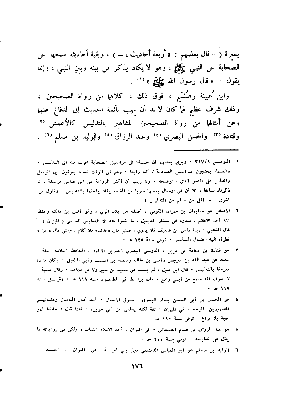 وابن عيينة وهشيم، فوق ذلك، كلاهما من رواة " الصحيحين " وذلك شرف عظيم لهما كان لا بد أن يهيب بأئمة الحديث إلى الدفاع عنهما وعن أمثالهما من رواة " الصحيحين " المشاهير بالتدليس كالأعمش (¬2) وقتادة (¬3) والحسن البصري (¬4) وعبد الرزاق (¬5) والوليد بن مسلم (¬6).