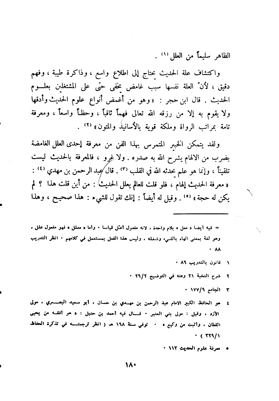 ولقد يتمكن الخبير المتمرس بهذا الفن من معرفة إحدى العلل الغامضة بضرب من الإلهام يشرح اللهُ به صدره. ولا غرو، فالمعرفة بالحديث ليست تلقينًا، وإنما هو علم يُحْدِثُهُ اللهُ في القلب (¬3). قال عبد الرحمن بن مهدي (¬4): «مَعْرِفَةُ الحَدِيثِ إِلْهَامٌ، فَلَوْ قُلْتَ لِلْعَالِمِ يُعَلِّلُ الحَدِيثَ: مِنْ أَيْنَ قُلْتَ هَذَا؟، لَمْ يَكُنْ لَهُ حُجَّةٌ» (¬5). وَقِيلَ لَهُ أَيْضًا: «إِنَّكَ تَقُولُ لِلشَّيْءِ: هَذَا صَحِيحٌ وَهَذَا