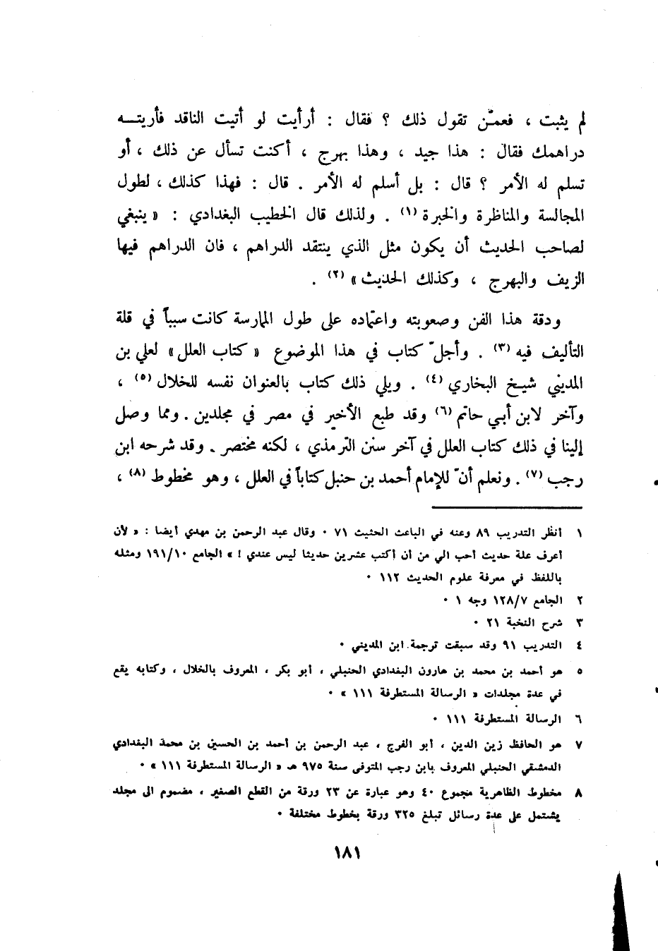 ودقة هذا الفن وصعوبته واعتماده على طول الممارسة كانت سببًا في قلة التأليف فيه (¬3). وَأَجَلُّ كتاب في هذا الموضوع " كتاب العلل " لعلي بن المديني شيخ البخاري (¬4). ويلي ذلك كتاب بالعنوان نفسه للخلال (¬5)، وآخر لابن أبي حاتم (¬6) وقد طبع الأخير في مصر في مجلدين. ومما وصل إلينا في ذلك كتاب " العلل " في آخر " سنن الترمذي "، لكنه مختصر، وقد شرحه ابن رجب (¬7). ونعلم أن للإمام أحمد بن حنبل كتابًا في العلل، وهو مخطوط (¬8).