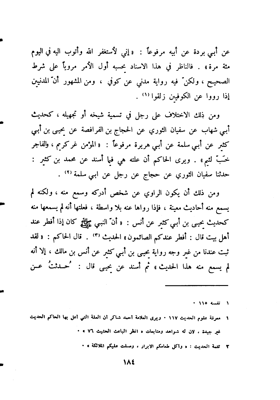 عَنْ أَبِي بُرْدَةَ , عَنْ أَبِيهِ , مَرْفُوعًا: «إِنِّي لأَسْتَغْفِرُ اللَّهَ وَأَتُوبُ إِلَيْهِ فِي اليَوْمِ مِائَةَ مَرَّةٍ». فالناظر في هذا الإسناد يحسبه أول الأمر مرويًا على شرط الصحيح، ولكن فيه رواية المدني عن كوفي، ومن المشهور أن المدنيين إذا رووا عن الكوفيين زلقوا (¬1).