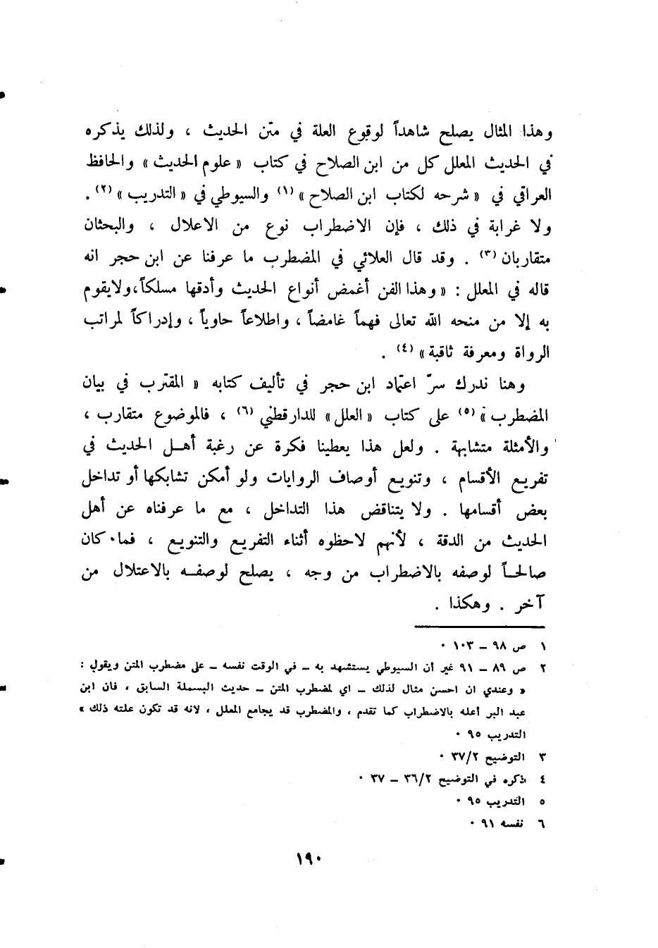 وهنا ندرك سر اعتماد ابن حجر في تأليف كتابه " المقترب في بيان المضطرب " (¬5) على كتاب " العلل " للدارقطني (¬6)، فالموضوع متقارب، والأمثلة متشابهة. ولعل هذا يعطينا فكرة عن رغبة أهل الحديث في تفريع الأقسام، وتنويع أوصاف الروايات ولو أمكن تشابكها أو تداخل بعض أقسامها. ولا يتناقض هذا التداخل، مع ما عرفناه عن أهل الحديث من الدقة، لأنهم لاحظوه أثناء التفريع والتنويع، فما كان صَالِحًا لوصفه بالاضطراب من وجه، يصلح لوصفه بالاعتلال من آخر. وهكذا.