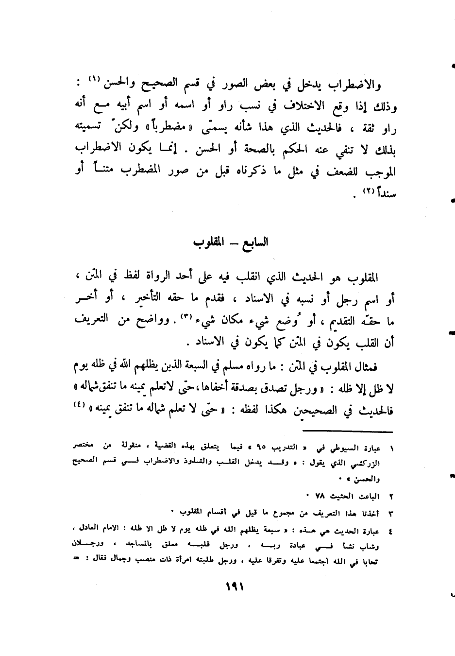 (¬1) عبارة السيوطي في، " التدريب ": ص 65، فيما يتعلق بهذه القضية، منقولة من " مختصر " الزركشي الذي يقول: «وَقَدْ يَدْخُلُ القَلْبُ وَالشُّذُوذُ وَالاِضْطِرَابُ فِي قِسْمِ الصَّحِيحِ وَالحَسَنِ».