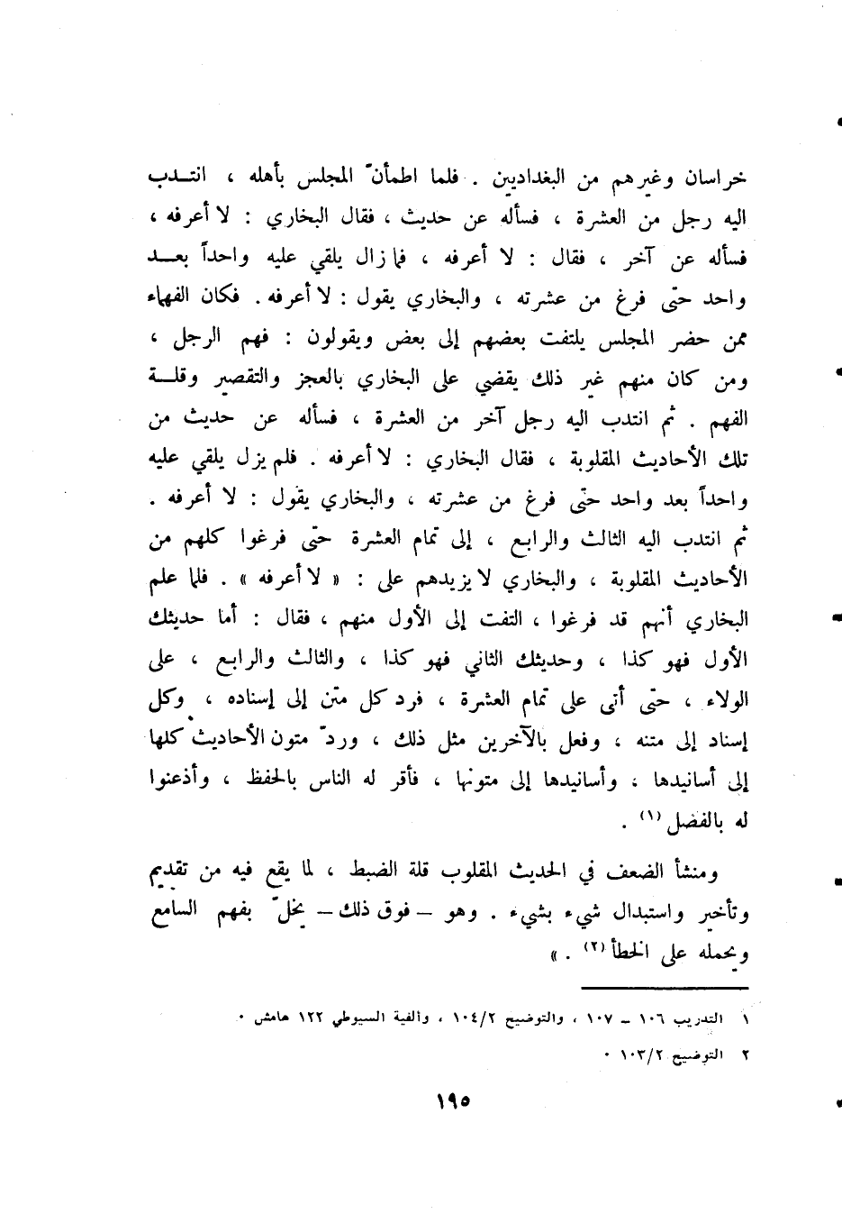 خُرَاسَانَ وَغَيْرِهِمْ وَمِنَ البَغْدَادِيِّينَ. فَلَمَّا اطْمَأَنَّ المَجْلِسُ بِأَهْلِهِ، انْتُدِبَ إِلَيْهِ رَجُلٌ مِنَ العَشَرَةِ، فَسَأَلَهُ عَنْ حَدِيثٍ مِنْ تِلْكَ الأَحَادِيثِ، فَقَالَ الْبُخَارِيُّ: «لاَ أَعْرِفُهُ»، فَسَأَلَهُ عَنْ آخَرَ فَقَالَ: «لاَ أَعْرِفُهُ»، فَمَا زَالَ يُلْقِي عَلَيْهِ وَاحِدًا بَعْدَ وَاحِدٍ حَتَّى فَرَغَ مِنْ عَشَرَتِهِ، وَالبُخَارِيُّ يَقُولُ: «لاَ أَعْرِفُهُ»، فَكَانَ الفُقَهَاءُ مِمَّنْ حَضَرَ المَجْلِسَ يَلْتَفِتُ بَعْضُهُمْ إِلَى بَعْضٍ، وَيَقُولُونَ: فَهِمَ الرَّجُلُ، وَمَنْ كَانَ مِنْهُمْ غَيْرَ ذَلِكَ يَقْضِي عَلَى البُخَارِيِّ بِالعَجْزِ وَالتَّقْصِيرِ، وَقِلَّةِ الْفَهْمِ. ثُمَّ انْتُدِبَ إِلَيْهِ رَجُلٌ آخَرُ مِنَ الْعَشَرَةِ، فَسَأَلَهُ عَنْ حَدِيثٍ مِنْ تِلْكَ الأَحَادِيثِ المَقْلُوبَةِ، فَقَالَ الْبُخَارِيُّ: «لاَ أَعْرِفُهُ»، فَلَمْ يَزَلْ يُلْقِي إِلَيْهِ، وَاحِدًا بَعْدَ وَاحِدٍ حَتَّى فَرَغَ مِنْ عَشَرَتِهِ، وَالْبُخَارِيُّ يَقُولُ: «لاَ أَعْرِفُهُ»، ثُمَّ انْتُدِبَ إِلَيْهِ الثَّالِثُ وَالرَّابِعُ إِلَى تَمَامِ العَشَرَةِ، حَتَّى فَرَغُوا كُلُّهُمْ مِنَ الأَحَادِيثِ المَقْلُوبَةِ، وَالبُخَارِيُّ لاَ يَزِيدُهُمْ عَلَى: «لاَ أَعْرِفُهُ»، فَلَمَّا عَلِمَ البُخَارِيُّ أَنَّهُمْ قَدْ فَرَغُوا، الْتَفَتَ إِلَى الأَوَّلِ مِنْهُمْ، فَقَالَ: «أَمَّا حَدِيثُكَ الأَوَّلُ، فَهُوَ كَذَا، وَحَدِيثُكَ الثَّانِي فَهُوَ كَذَا، وَالثَّالِثُ، وَالرَّابِعُ عَلَى الوَلاَءِ»، حَتَّى أَتَى عَلَى تَمَامِ العَشَرَةِ، فَرَدَّ كُلَّ مَتْنٍ إِلَى إِسْنَادِهِ، وَكُلَّ إِسْنَادٍ إِلَى مَتْنِهِ، وَفَعَلَ بِالآخَرِينَ مِثْلَ ذَلِكَ، وَرَدَّ مُتُونَ الأَحَادِيثِ إِلَى أَسَانِيدِهَا، وَأَسَانِيدَهَا إِلَى مُتُونِهَا، فَأَقَرَّ لَهُ النَّاسُ بِالحِفْظِ، وَأَذْعَنُوا لَهُ بِالْفَضْلِ (¬1).