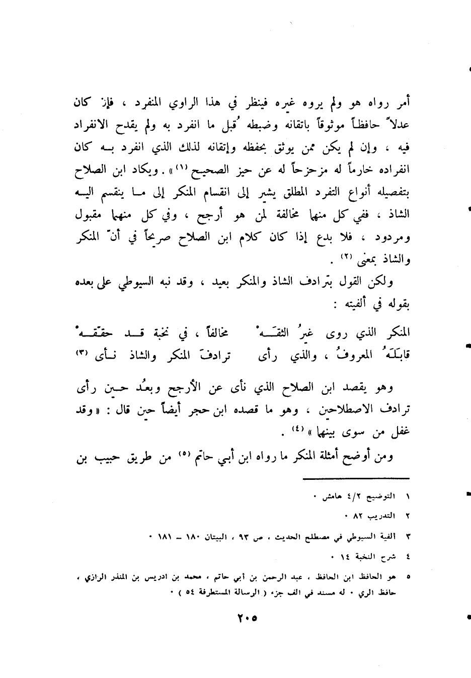 أَمْرٌ رَوَاهُ هُوَ وَلَمْ يَرْوِهِ غَيْرُهُ فَيُنْظَرُ فِي هَذَا الرَّاوِي المُنْفَرِدِ، فَإِنْ كَانَ عَدْلاً حَافِظًا مَوْثُوقًا بِإِتْقَانِهِ وَضَبْطِهِ قَبْلَ مَا اِنْفَرَدَ بِهِ وَلَمْ يُقْدَحْ الاِنْفِرَادُ فِيهِ، وَإِنْ لَمْ يَكُنْ مِمَّنْ يُوثَقُ بِحِفْظِهِ وَإِتْقَانِهِ لِذَلِكَ الذِي اِنْفَرَدَ بِهِ كَانَ اِنْفِرَادُهُ خَارِمًا لَهُ مُزَحْزِحًا لَهُ عَنْ حَيِّزِ الصَّحِيحِ» (¬1). ويكاد ابن الصلاح بتفصيله أنواع التفرد المطلق يشير إلى انقسام المنكر إلى ما ينقسم إليه الشاذ. ففي كل منهما مخالفة لمن هو أرجح، وفي كل منهما مقبول ومردود، فلا بدع إذا كان كلام ابن الصلاح صريحًا في أن المنكر والشاذ بمعنى (¬2).