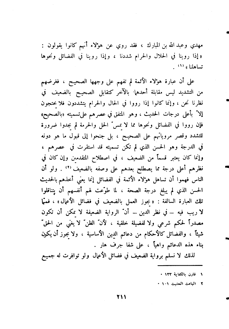 مهدي وعبد الله بن المبارك، فقد روي عن هؤلاء أنهم كانوا يقولون: «إِذَا رَوِينَا فِي الحَلاَلِ وَالحَرَامِ شَدَّدْنَا، وَإِذَا رَوِينَا فِي الفَضَائِلِ وَنَحْوِهَا تَسَاهَلْنَا» (¬1).