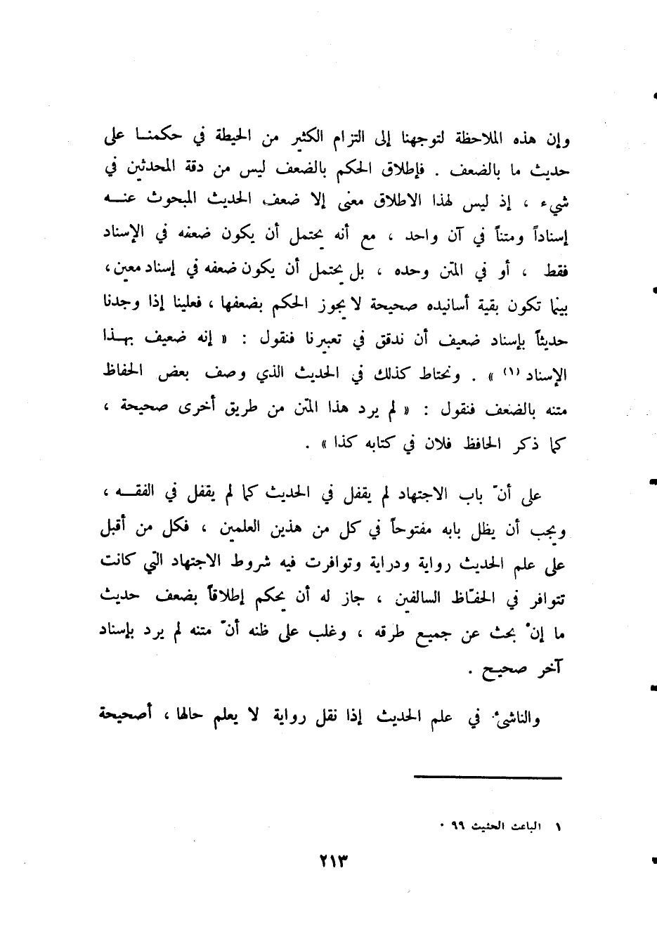 على أن باب الاجتهاد لم يقفل في الحديث كما لم يقفل في الفقه، ويجب أن يظل بابه مفتوحًا في كل من هذين العلمين، فكل من أقبل على علم الحديث رواية ودراية وتوافرت فيه شروط الاجتهاد التى كانت تتوافر في الحفّاظ السالفين، جاز له أن يحكم إطلاقًا بضعف حديث ما إن بحث عن جميع طرقه، وغلب على ظنه أن متنه لم يرد بإسناد آخر صحيح.