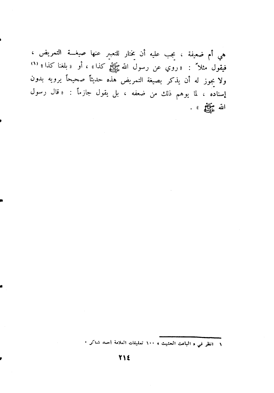 هي أم ضعيفة، يجب عليه أن يختار للتعبير عنها صيغة التمريض، فيقول مثلاً: «رُوِيَ عَنْ رَسُولِ اللهِ - صَلََّى اللهُ عَلَيْهِ وَسَلَّمَ - كَذَا»، أَوْ «بَلَغَنَا كَذَا» (¬1).